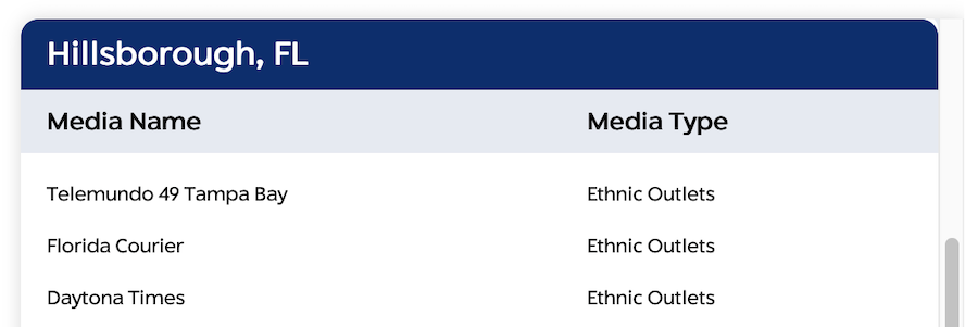 Among them, the Daytona Times, which describes itself as “the reliable and credible source for news and information about African American communities in East Florida,” is listed as being in Hillsborough County, on the west side of Florida. Um.