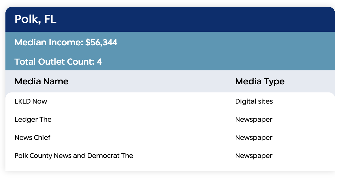 Friedman gave as another example Lake Wales News, which is missing from Medill’s list for Polk County, Florida.