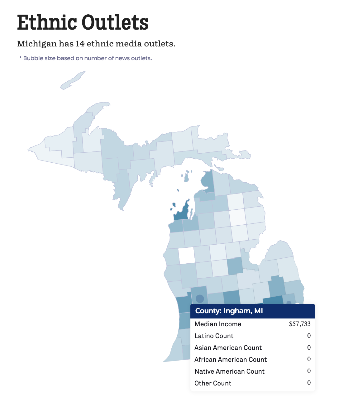 Yet when you click on the Medill map for our county (Ingham), the map shows zero “ethnic outlets” of news. Either New Citizens Press is miscategorized or this 22-year-old newspaper is completely missing.